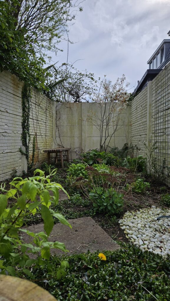 De bewoners rond het Veenbergplein waren behoorlijk uitgekeken op het eeuwige donkergroen van kardinaalsmuts en laurierkers. Ze vroegen bij de gemeente om budget om een buurttuin te maken met veel meer diversiteit aan beplanting. Na een sessie met de bewoners waarin nog veel meer wensen boven tafel kwamen heb ik het ontwerp gemaakt. Spaarnelanden haalde vervolgens de bosjes weg, leverde een teelaarde, houtsnippers en boomstammen en de bewoners richten het plein in naar ontwerp. Voor het verdelen van de planten in de borders kwam ik nog een ochtend terug, waarna zij ze allemaal hebben aangeplant.