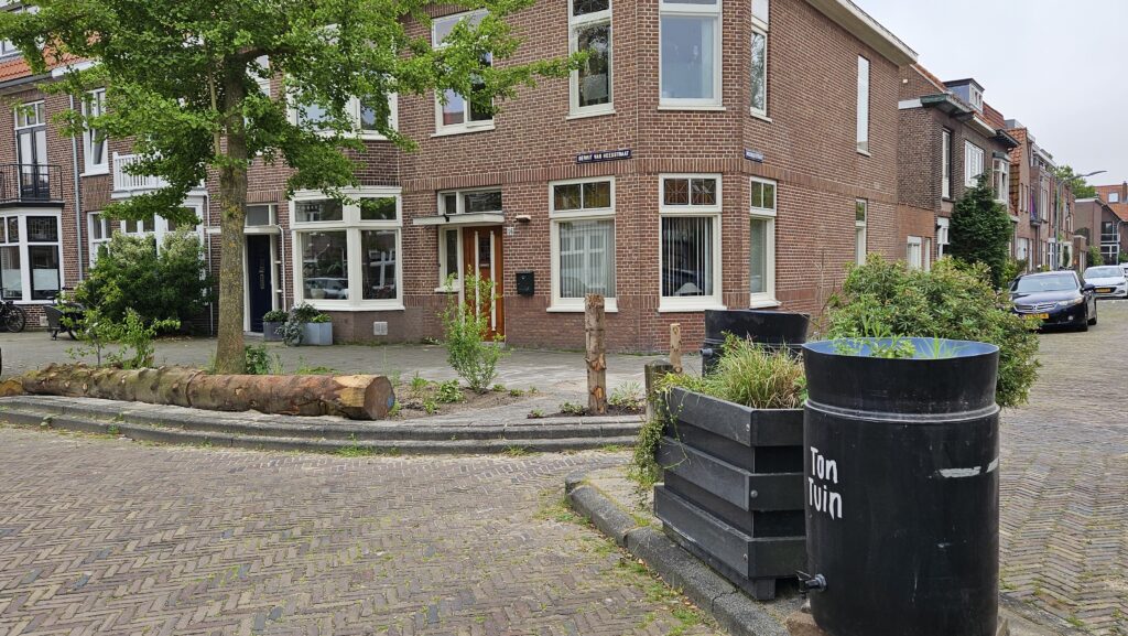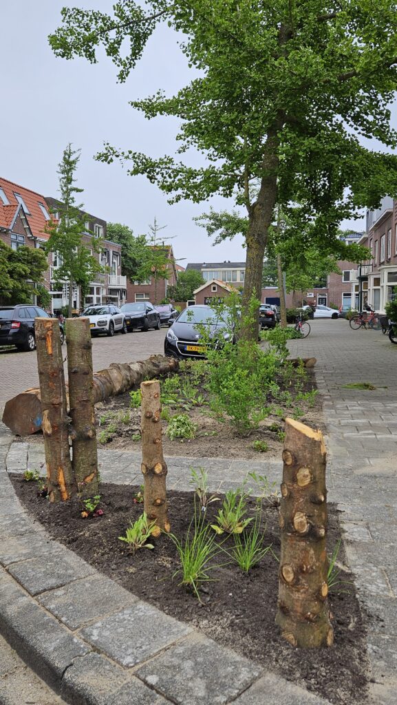 Een bewonersinitiatief in Haarlem vroeg de gemeente om overbodige verharding op de stoepen rond een kruispunt weg te halen. Zonder dat auto’s weer kans zien om op de stoep te parkeren. Het hout daarvoor vond ik op de werf van Spaarnelanden in de vorm van de kerstboom die op de Grote Markt stond. De plantvakken met inheemse en mediterrane vaste planten worden door hen onderhouden. In het midden van het kruispunt staan bloembakken en regentonnen van TonTuin om het verkeer te begeleiden.