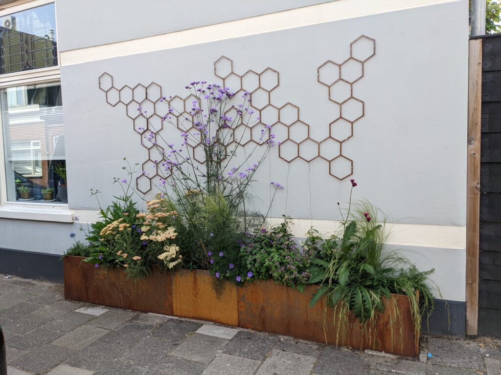 Deze geveltuin ligt in een druk belopen straat waar ook veel honden worden uitgelaten. Mede daarom is gekozen voor een verhoogde border. Het roestige staal komt terug in het rek voor klimplanten en past mooi bij de kleur van de gevel. Het patroon van bijenraten geeft de motivatie van de bewoners weer voor de aanleg van de border: meer voedsel voor de bij!